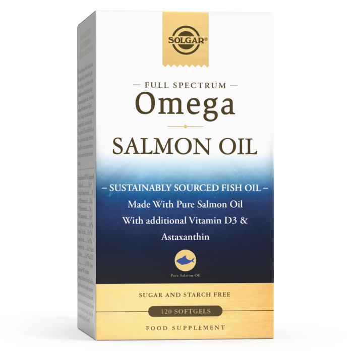 Losos je jedan od najbogatijih izvora EPA (eikozapentaenske kiseline) i DHA (dokozaheksaenske kiseline) što ga čini iznimno zdravim.1-2 SOLGAR FULL SPECTRUM OMEGA SALMON OIL sadržava pročišćeno riblje ulje norveškog lososa te osigurava cijeli spektar omega masnih kiselina, pomažući vam da povećate unos dobrih masti za zdravo srce. Proces pročišćavanja osigurava učinkovito uklanjanje teških metala iz ulja, uz očuvanje optimalnog integriteta i biološke aktivnosti proizvoda. Udio EPA, DHA i drugih masnih kiselina pronađenih u Full Spectrum Omega Salmon Oil, kao i njihovih omjera, slični su onima koji se nalaze u divljem lososu. Masti se sastoje od različitih vrsta masnih kiselina koje su u malim količinama potrebne za zdravlje i dobrobit.5 Omega-3 i omega-6 masne kiseline nazivaju se esencijalnim masnim kiselinama jer ih tijelo ne može proizvesti i potrebno ih je unositi hranom. Proizvod je obogaćen vitamin D potrebnim za mnoge fiziološke procese organizma, a poglavito za održavanje normalne funkcije mišića, kostiju, zubi i imunosnog sustava. Važan aktivan sastojak te formulacije je i snažan prirodni astaksantin, karotenoidni pigment topljiv u ulju odgovaran za karakterističnu jarku boju lososa.